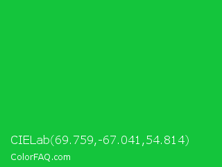 CIELab 69.759,-67.041,54.814 Color is a normal green color and the nearest color is Dark Pastel Green #03c03c. Hex code #14c53c and RGB value is rgb(20,197,60). In RGB color space, this color is composed of 8% red, 77% green, 24% blue, In CMYK color space, this color is composed of 90% cyan, 0% magenta, 70% yellow , 23% black , In HSL color space, this color has a hue angle of 134° , 82% saturation and 43% lightness.