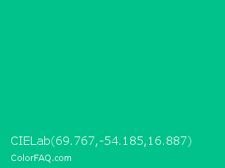 CIELab 69.767,-54.185,16.887 Color is a normal green color and the nearest color is Caribbean Green #00cc99. Hex code #00c28a and RGB value is rgb(0,194,138). In RGB color space, this color is composed of 0% red, 76% green, 54% blue, In CMYK color space, this color is composed of 100% cyan, 0% magenta, 29% yellow , 24% black , In HSL color space, this color has a hue angle of 163° , 100% saturation and 38% lightness.