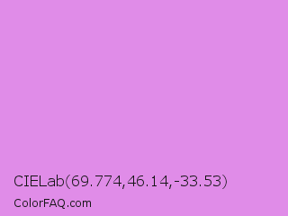CIELab 69.774,46.14,-33.53 Color is a light magenta color and the nearest color is Bright Lilac #d891ef. Hex code #e08ce8 and RGB value is rgb(224,140,232). In RGB color space, this color is composed of 88% red, 55% green, 91% blue, In CMYK color space, this color is composed of 3% cyan, 40% magenta, 0% yellow , 9% black , In HSL color space, this color has a hue angle of 295° , 67% saturation and 73% lightness.