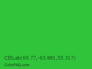 CIELab 69.77,-63.881,55.317 Color is a normal green color and the nearest color is Lime Green #32cd32. Hex code #30c43b and RGB value is rgb(48,196,59). In RGB color space, this color is composed of 19% red, 77% green, 23% blue, In CMYK color space, this color is composed of 76% cyan, 0% magenta, 70% yellow , 23% black , In HSL color space, this color has a hue angle of 124° , 61% saturation and 48% lightness.