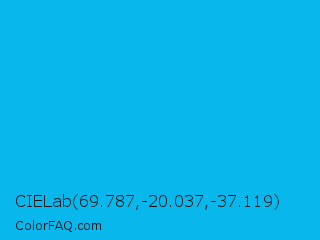 CIELab 69.787,-20.037,-37.119 Color is a normal blue color and the nearest color is Cyan Process #00b7eb. Hex code #08b8ed and RGB value is rgb(8,184,237). In RGB color space, this color is composed of 3% red, 72% green, 93% blue, In CMYK color space, this color is composed of 97% cyan, 22% magenta, 0% yellow , 7% black , In HSL color space, this color has a hue angle of 194° , 93% saturation and 48% lightness.