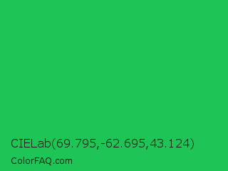 CIELab 69.795,-62.695,43.124 Color is a normal green color and the nearest color is Malachite #0bda51. Hex code #1fc457 and RGB value is rgb(31,196,87). In RGB color space, this color is composed of 12% red, 77% green, 34% blue, In CMYK color space, this color is composed of 84% cyan, 0% magenta, 56% yellow , 23% black , In HSL color space, this color has a hue angle of 140° , 73% saturation and 45% lightness.