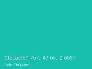 CIELab 69.797,-43.06,-2.088 Color is a normal cyan color and the nearest color is Tiffany Blue #0abab5. Hex code #17bfad and RGB value is rgb(23,191,173). In RGB color space, this color is composed of 9% red, 75% green, 68% blue, In CMYK color space, this color is composed of 88% cyan, 0% magenta, 9% yellow , 25% black , In HSL color space, this color has a hue angle of 174° , 79% saturation and 42% lightness.