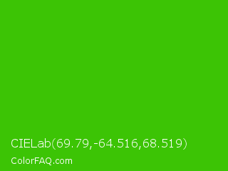 CIELab 69.79,-64.516,68.519 Color is a normal green color and the nearest color is Harlequin Green #46cb18. Hex code #3cc405 and RGB value is rgb(60,196,5). In RGB color space, this color is composed of 24% red, 77% green, 2% blue, In CMYK color space, this color is composed of 69% cyan, 0% magenta, 97% yellow , 23% black , In HSL color space, this color has a hue angle of 103° , 95% saturation and 39% lightness.