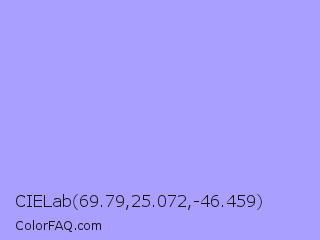 CIELab 69.79,25.072,-46.459 Color is a very light indigo color and the nearest color is Biloba Flower #b2a1ea. Hex code #a99fff and RGB value is rgb(169,159,255). In RGB color space, this color is composed of 66% red, 62% green, 100% blue, In CMYK color space, this color is composed of 34% cyan, 38% magenta, 0% yellow , 0% black , In HSL color space, this color has a hue angle of 246° , 100% saturation and 81% lightness.