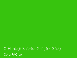CIELab 69.7,-65.241,67.367 Color is a normal green color and the nearest color is Harlequin Green #46cb18. Hex code #37c40e and RGB value is rgb(55,196,14). In RGB color space, this color is composed of 22% red, 77% green, 5% blue, In CMYK color space, this color is composed of 72% cyan, 0% magenta, 93% yellow , 23% black , In HSL color space, this color has a hue angle of 106° , 87% saturation and 41% lightness.