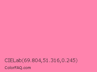 CIELab 69.804,51.316,0.245 Color is a light rose color and the nearest color is Tickle Me Pink #fc89ac. Hex code #ff83ac and RGB value is rgb(255,131,172). In RGB color space, this color is composed of 100% red, 51% green, 67% blue, In CMYK color space, this color is composed of 0% cyan, 49% magenta, 33% yellow , 0% black , In HSL color space, this color has a hue angle of 340° , 100% saturation and 76% lightness.