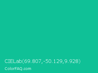 CIELab 69.807,-50.129,9.928 Color is a normal cyan color and the nearest color is Caribbean Green #00cc99. Hex code #0fc197 and RGB value is rgb(15,193,151). In RGB color space, this color is composed of 6% red, 76% green, 59% blue, In CMYK color space, this color is composed of 92% cyan, 0% magenta, 22% yellow , 24% black , In HSL color space, this color has a hue angle of 166° , 86% saturation and 41% lightness.