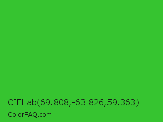 CIELab 69.808,-63.826,59.363 Color is a normal green color and the nearest color is Lime Green #32cd32. Hex code #36c430 and RGB value is rgb(54,196,48). In RGB color space, this color is composed of 21% red, 77% green, 19% blue, In CMYK color space, this color is composed of 72% cyan, 0% magenta, 76% yellow , 23% black , In HSL color space, this color has a hue angle of 118° , 61% saturation and 48% lightness.