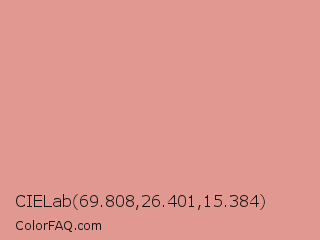 CIELab 69.808,26.401,15.384 Color is a light red color and the nearest color is Petite Orchid #db9690. Hex code #e19890 and RGB value is rgb(225,152,144). In RGB color space, this color is composed of 88% red, 60% green, 56% blue, In CMYK color space, this color is composed of 0% cyan, 32% magenta, 36% yellow , 12% black , In HSL color space, this color has a hue angle of 6° , 57% saturation and 72% lightness.