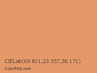 CIELab 69.811,23.557,36.171 Color is a light orange color and the nearest color is Apricot #eb9373. Hex code #e5996a and RGB value is rgb(229,153,106). In RGB color space, this color is composed of 90% red, 60% green, 42% blue, In CMYK color space, this color is composed of 0% cyan, 33% magenta, 54% yellow , 10% black , In HSL color space, this color has a hue angle of 23° , 70% saturation and 66% lightness.