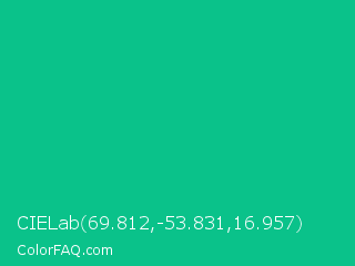 CIELab 69.812,-53.831,16.957 Color is a normal green color and the nearest color is Caribbean Green #00cc99. Hex code #0ac28a and RGB value is rgb(10,194,138). In RGB color space, this color is composed of 4% red, 76% green, 54% blue, In CMYK color space, this color is composed of 95% cyan, 0% magenta, 29% yellow , 24% black , In HSL color space, this color has a hue angle of 162° , 90% saturation and 40% lightness.