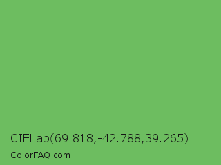 CIELab 69.818,-42.788,39.265 Color is a normal green color and the nearest color is Mantis #74c365. Hex code #6dbd60 and RGB value is rgb(109,189,96). In RGB color space, this color is composed of 43% red, 74% green, 38% blue, In CMYK color space, this color is composed of 42% cyan, 0% magenta, 49% yellow , 26% black , In HSL color space, this color has a hue angle of 112° , 41% saturation and 56% lightness.