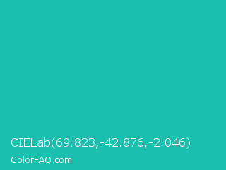 CIELab 69.823,-42.876,-2.046 Color is a normal cyan color and the nearest color is Light Sea Green #20b2aa. Hex code #1abfad and RGB value is rgb(26,191,173). In RGB color space, this color is composed of 10% red, 75% green, 68% blue, In CMYK color space, this color is composed of 86% cyan, 0% magenta, 9% yellow , 25% black , In HSL color space, this color has a hue angle of 173° , 76% saturation and 43% lightness.