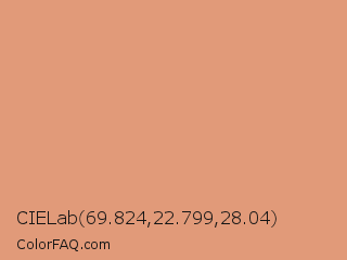 CIELab 69.824,22.799,28.04 Color is a light orange color and the nearest color is Dark Salmon #e9967a. Hex code #e19a79 and RGB value is rgb(225,154,121). In RGB color space, this color is composed of 88% red, 60% green, 47% blue, In CMYK color space, this color is composed of 0% cyan, 32% magenta, 46% yellow , 12% black , In HSL color space, this color has a hue angle of 19° , 63% saturation and 68% lightness.