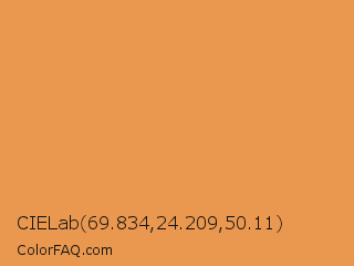 CIELab 69.834,24.209,50.11 Color is a light orange color and the nearest color is Big Foot Feet #e88e5a. Hex code #ea984f and RGB value is rgb(234,152,79). In RGB color space, this color is composed of 92% red, 60% green, 31% blue, In CMYK color space, this color is composed of 0% cyan, 35% magenta, 66% yellow , 8% black , In HSL color space, this color has a hue angle of 28° , 79% saturation and 61% lightness.