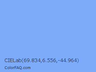 CIELab 69.834,6.556,-44.964 Color is a light blue color and the nearest color is French Sky Blue #77b5fe. Hex code #7dabfc and RGB value is rgb(125,171,252). In RGB color space, this color is composed of 49% red, 67% green, 99% blue, In CMYK color space, this color is composed of 50% cyan, 32% magenta, 0% yellow , 1% black , In HSL color space, this color has a hue angle of 218° , 95% saturation and 74% lightness.