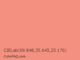 CIELab 69.848,35.645,25.176 Color is a light red color and the nearest color is Dark Salmon #e9967a. Hex code #f3907f and RGB value is rgb(243,144,127). In RGB color space, this color is composed of 95% red, 56% green, 50% blue, In CMYK color space, this color is composed of 0% cyan, 41% magenta, 48% yellow , 5% black , In HSL color space, this color has a hue angle of 9° , 83% saturation and 73% lightness.