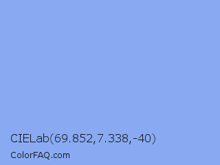 CIELab 69.852,7.338,-40 Color is a light blue color and the nearest color is Portage #8b9fee. Hex code #89aaf3 and RGB value is rgb(137,170,243). In RGB color space, this color is composed of 54% red, 67% green, 95% blue, In CMYK color space, this color is composed of 44% cyan, 30% magenta, 0% yellow , 5% black , In HSL color space, this color has a hue angle of 221° , 82% saturation and 75% lightness.