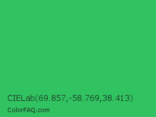 CIELab 69.857,-58.769,38.413 Color is a normal green color and the nearest color is UFO Green #3cd070. Hex code #31c361 and RGB value is rgb(49,195,97). In RGB color space, this color is composed of 19% red, 76% green, 38% blue, In CMYK color space, this color is composed of 75% cyan, 0% magenta, 50% yellow , 24% black , In HSL color space, this color has a hue angle of 140° , 60% saturation and 48% lightness.