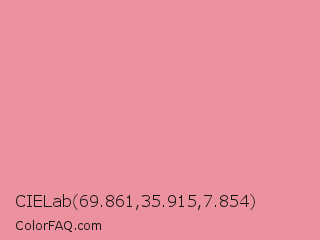 CIELab 69.861,35.915,7.854 Color is a light red color and the nearest color is Sea Pink #ed989e. Hex code #ec919e and RGB value is rgb(236,145,158). In RGB color space, this color is composed of 93% red, 57% green, 62% blue, In CMYK color space, this color is composed of 0% cyan, 39% magenta, 33% yellow , 7% black , In HSL color space, this color has a hue angle of 351° , 71% saturation and 75% lightness.