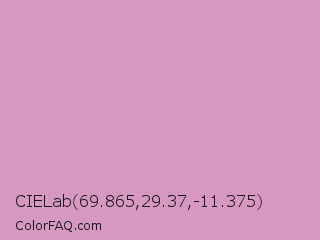 CIELab 69.865,29.37,-11.375 Color is a light magenta color and the nearest color is Light Medium Orchid #d39bcb. Hex code #d698c0 and RGB value is rgb(214,152,192). In RGB color space, this color is composed of 84% red, 60% green, 75% blue, In CMYK color space, this color is composed of 0% cyan, 29% magenta, 10% yellow , 16% black , In HSL color space, this color has a hue angle of 321° , 43% saturation and 72% lightness.