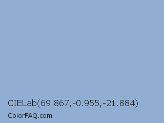 CIELab 69.867,-0.955,-21.884 Color is a light blue color and the nearest color is Polo Blue #8da8cc. Hex code #91add2 and RGB value is rgb(145,173,210). In RGB color space, this color is composed of 57% red, 68% green, 82% blue, In CMYK color space, this color is composed of 31% cyan, 18% magenta, 0% yellow , 18% black , In HSL color space, this color has a hue angle of 214° , 42% saturation and 70% lightness.