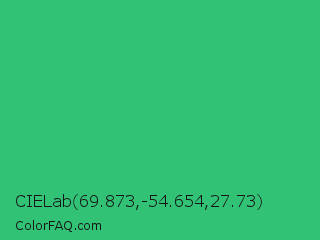 CIELab 69.873,-54.654,27.73 Color is a normal green color and the nearest color is UFO Green #3cd070. Hex code #32c276 and RGB value is rgb(50,194,118). In RGB color space, this color is composed of 20% red, 76% green, 46% blue, In CMYK color space, this color is composed of 74% cyan, 0% magenta, 39% yellow , 24% black , In HSL color space, this color has a hue angle of 148° , 59% saturation and 48% lightness.