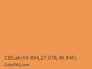 CIELab 69.894,27.078,48.845 Color is a light orange color and the nearest color is Big Foot Feet #e88e5a. Hex code #ee9652 and RGB value is rgb(238,150,82). In RGB color space, this color is composed of 93% red, 59% green, 32% blue, In CMYK color space, this color is composed of 0% cyan, 37% magenta, 66% yellow , 7% black , In HSL color space, this color has a hue angle of 26° , 82% saturation and 63% lightness.