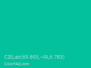 CIELab 69.895,-49,6.783 Color is a normal cyan color and the nearest color is Caribbean Green #00cc99. Hex code #04c19d and RGB value is rgb(4,193,157). In RGB color space, this color is composed of 2% red, 76% green, 62% blue, In CMYK color space, this color is composed of 98% cyan, 0% magenta, 19% yellow , 24% black , In HSL color space, this color has a hue angle of 169° , 96% saturation and 39% lightness.