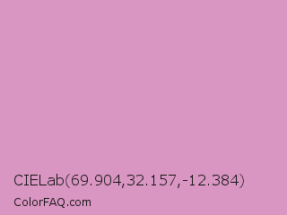 CIELab 69.904,32.157,-12.384 Color is a light magenta color and the nearest color is Shocking #e292c0. Hex code #da96c2 and RGB value is rgb(218,150,194). In RGB color space, this color is composed of 85% red, 59% green, 76% blue, In CMYK color space, this color is composed of 0% cyan, 31% magenta, 11% yellow , 15% black , In HSL color space, this color has a hue angle of 321° , 48% saturation and 72% lightness.