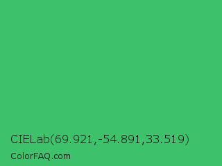CIELab 69.921,-54.891,33.519 Color is a normal green color and the nearest color is UFO Green #3cd070. Hex code #3dc26b and RGB value is rgb(61,194,107). In RGB color space, this color is composed of 24% red, 76% green, 42% blue, In CMYK color space, this color is composed of 69% cyan, 0% magenta, 45% yellow , 24% black , In HSL color space, this color has a hue angle of 141° , 52% saturation and 50% lightness.