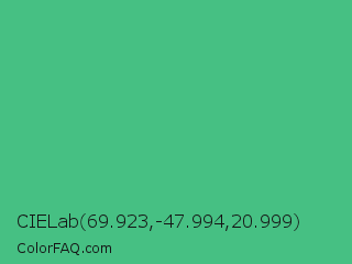 CIELab 69.923,-47.994,20.999 Color is a normal green color and the nearest color is Ocean Green #48bf91. Hex code #46c083 and RGB value is rgb(70,192,131). In RGB color space, this color is composed of 27% red, 75% green, 51% blue, In CMYK color space, this color is composed of 64% cyan, 0% magenta, 32% yellow , 25% black , In HSL color space, this color has a hue angle of 150° , 49% saturation and 51% lightness.