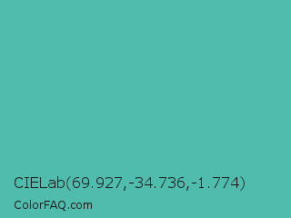 CIELab 69.927,-34.736,-1.774 Color is a normal cyan color and the nearest color is Verdigris #43b3ae. Hex code #4fbcad and RGB value is rgb(79,188,173). In RGB color space, this color is composed of 31% red, 74% green, 68% blue, In CMYK color space, this color is composed of 58% cyan, 0% magenta, 8% yellow , 26% black , In HSL color space, this color has a hue angle of 172° , 45% saturation and 52% lightness.
