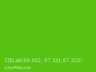 CIELab 69.932,-57.331,67.323 Color is a normal green color and the nearest color is Kelly Green #4cbb17. Hex code #57c212 and RGB value is rgb(87,194,18). In RGB color space, this color is composed of 34% red, 76% green, 7% blue, In CMYK color space, this color is composed of 55% cyan, 0% magenta, 91% yellow , 24% black , In HSL color space, this color has a hue angle of 96° , 83% saturation and 42% lightness.