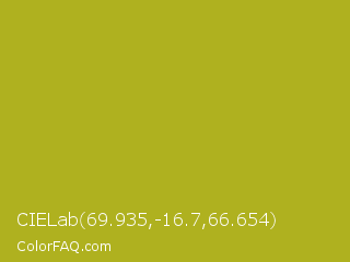 CIELab 69.935,-16.7,66.654 Color is a normal yellow color and the nearest color is Acid Green #b0bf1a. Hex code #afb11f and RGB value is rgb(175,177,31). In RGB color space, this color is composed of 69% red, 69% green, 12% blue, In CMYK color space, this color is composed of 1% cyan, 0% magenta, 82% yellow , 31% black , In HSL color space, this color has a hue angle of 61° , 70% saturation and 41% lightness.