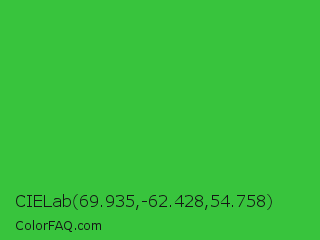 CIELab 69.935,-62.428,54.758 Color is a normal green color and the nearest color is Lime Green #32cd32. Hex code #38c43d and RGB value is rgb(56,196,61). In RGB color space, this color is composed of 22% red, 77% green, 24% blue, In CMYK color space, this color is composed of 71% cyan, 0% magenta, 69% yellow , 23% black , In HSL color space, this color has a hue angle of 122° , 56% saturation and 49% lightness.