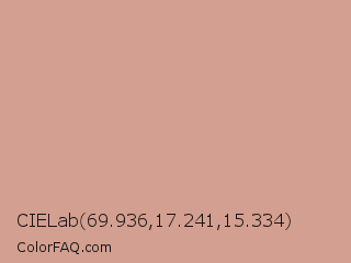 CIELab 69.936,17.241,15.334 Color is a light red color and the nearest color is Petite Orchid #db9690. Hex code #d39f90 and RGB value is rgb(211,159,144). In RGB color space, this color is composed of 83% red, 62% green, 56% blue, In CMYK color space, this color is composed of 0% cyan, 25% magenta, 32% yellow , 17% black , In HSL color space, this color has a hue angle of 13° , 43% saturation and 70% lightness.