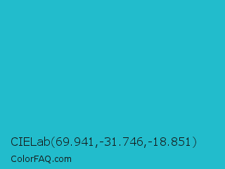 CIELab 69.941,-31.746,-18.851 Color is a normal cyan color and the nearest color is Java #1fc2c2. Hex code #22bccc and RGB value is rgb(34,188,204). In RGB color space, this color is composed of 13% red, 74% green, 80% blue, In CMYK color space, this color is composed of 83% cyan, 8% magenta, 0% yellow , 20% black , In HSL color space, this color has a hue angle of 186° , 71% saturation and 47% lightness.