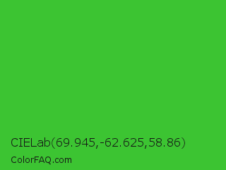 CIELab 69.945,-62.625,58.86 Color is a normal green color and the nearest color is Lime Green #32cd32. Hex code #3cc432 and RGB value is rgb(60,196,50). In RGB color space, this color is composed of 24% red, 77% green, 20% blue, In CMYK color space, this color is composed of 69% cyan, 0% magenta, 74% yellow , 23% black , In HSL color space, this color has a hue angle of 116° , 59% saturation and 48% lightness.
