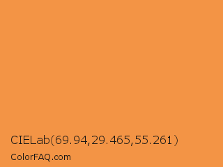 CIELab 69.94,29.465,55.261 Color is a light orange color and the nearest color is Jaffa #ef863f. Hex code #f39445 and RGB value is rgb(243,148,69). In RGB color space, this color is composed of 95% red, 58% green, 27% blue, In CMYK color space, this color is composed of 0% cyan, 39% magenta, 72% yellow , 5% black , In HSL color space, this color has a hue angle of 27° , 88% saturation and 61% lightness.