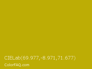 CIELab 69.977,-8.971,71.677 Color is a normal yellow color and the nearest color is Buddha Gold #c1a004. Hex code #bdad05 and RGB value is rgb(189,173,5). In RGB color space, this color is composed of 74% red, 68% green, 2% blue, In CMYK color space, this color is composed of 0% cyan, 8% magenta, 97% yellow , 26% black , In HSL color space, this color has a hue angle of 55° , 95% saturation and 38% lightness.
