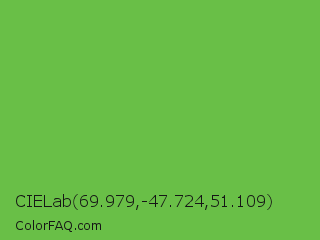 CIELab 69.979,-47.724,51.109 Color is a normal green color and the nearest color is Green RYB #66b032. Hex code #69bf47 and RGB value is rgb(105,191,71). In RGB color space, this color is composed of 41% red, 75% green, 28% blue, In CMYK color space, this color is composed of 45% cyan, 0% magenta, 63% yellow , 25% black , In HSL color space, this color has a hue angle of 103° , 48% saturation and 51% lightness.