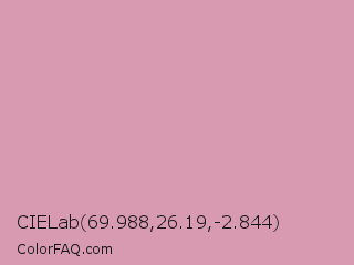 CIELab 69.988,26.19,-2.844 Color is a light rose color and the nearest color is Careys Pink #d29eaa. Hex code #d79ab1 and RGB value is rgb(215,154,177). In RGB color space, this color is composed of 84% red, 60% green, 69% blue, In CMYK color space, this color is composed of 0% cyan, 28% magenta, 18% yellow , 16% black , In HSL color space, this color has a hue angle of 337° , 43% saturation and 72% lightness.