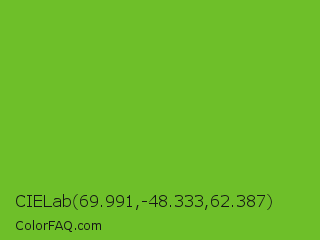 CIELab 69.991,-48.333,62.387 Color is a normal green color and the nearest color is Green RYB #66b032. Hex code #6ebf29 and RGB value is rgb(110,191,41). In RGB color space, this color is composed of 43% red, 75% green, 16% blue, In CMYK color space, this color is composed of 42% cyan, 0% magenta, 79% yellow , 25% black , In HSL color space, this color has a hue angle of 92° , 65% saturation and 45% lightness.