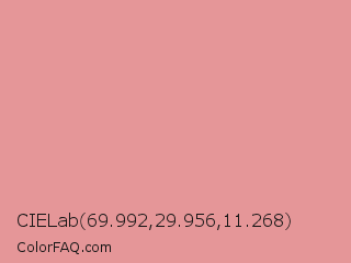 CIELab 69.992,29.956,11.268 Color is a light red color and the nearest color is Ruddy Pink #e18e96. Hex code #e59698 and RGB value is rgb(229,150,152). In RGB color space, this color is composed of 90% red, 59% green, 60% blue, In CMYK color space, this color is composed of 0% cyan, 34% magenta, 34% yellow , 10% black , In HSL color space, this color has a hue angle of 358° , 60% saturation and 74% lightness.