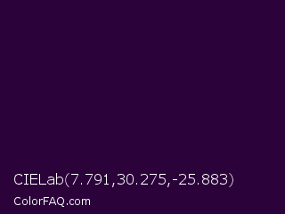 CIELab 7.791,30.275,-25.883 Color is a very dark purple color and the nearest color is Mardi Gras #350036. Hex code #2b023a and RGB value is rgb(43,2,58). In RGB color space, this color is composed of 17% red, 1% green, 23% blue, In CMYK color space, this color is composed of 26% cyan, 97% magenta, 0% yellow , 77% black , In HSL color space, this color has a hue angle of 284° , 93% saturation and 12% lightness.