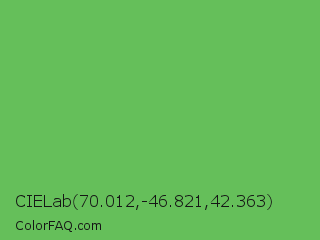 CIELab 70.012,-46.821,42.363 Color is a normal green color and the nearest color is Mantis #74c365. Hex code #65bf5a and RGB value is rgb(101,191,90). In RGB color space, this color is composed of 40% red, 75% green, 35% blue, In CMYK color space, this color is composed of 47% cyan, 0% magenta, 53% yellow , 25% black , In HSL color space, this color has a hue angle of 113° , 44% saturation and 55% lightness.