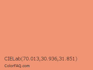CIELab 70.013,30.936,31.851 Color is a light orange color and the nearest color is Apricot #eb9373. Hex code #ef9473 and RGB value is rgb(239,148,115). In RGB color space, this color is composed of 94% red, 58% green, 45% blue, In CMYK color space, this color is composed of 0% cyan, 38% magenta, 52% yellow , 6% black , In HSL color space, this color has a hue angle of 16° , 79% saturation and 69% lightness.