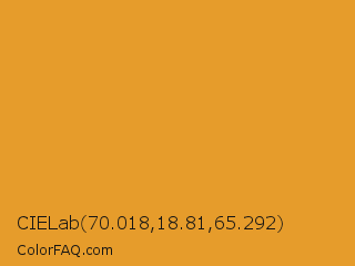 CIELab 70.018,18.81,65.292 Color is a normal orange color and the nearest color is Fire Bush #e89928. Hex code #e69c2b and RGB value is rgb(230,156,43). In RGB color space, this color is composed of 90% red, 61% green, 17% blue, In CMYK color space, this color is composed of 0% cyan, 32% magenta, 81% yellow , 10% black , In HSL color space, this color has a hue angle of 36° , 79% saturation and 54% lightness.